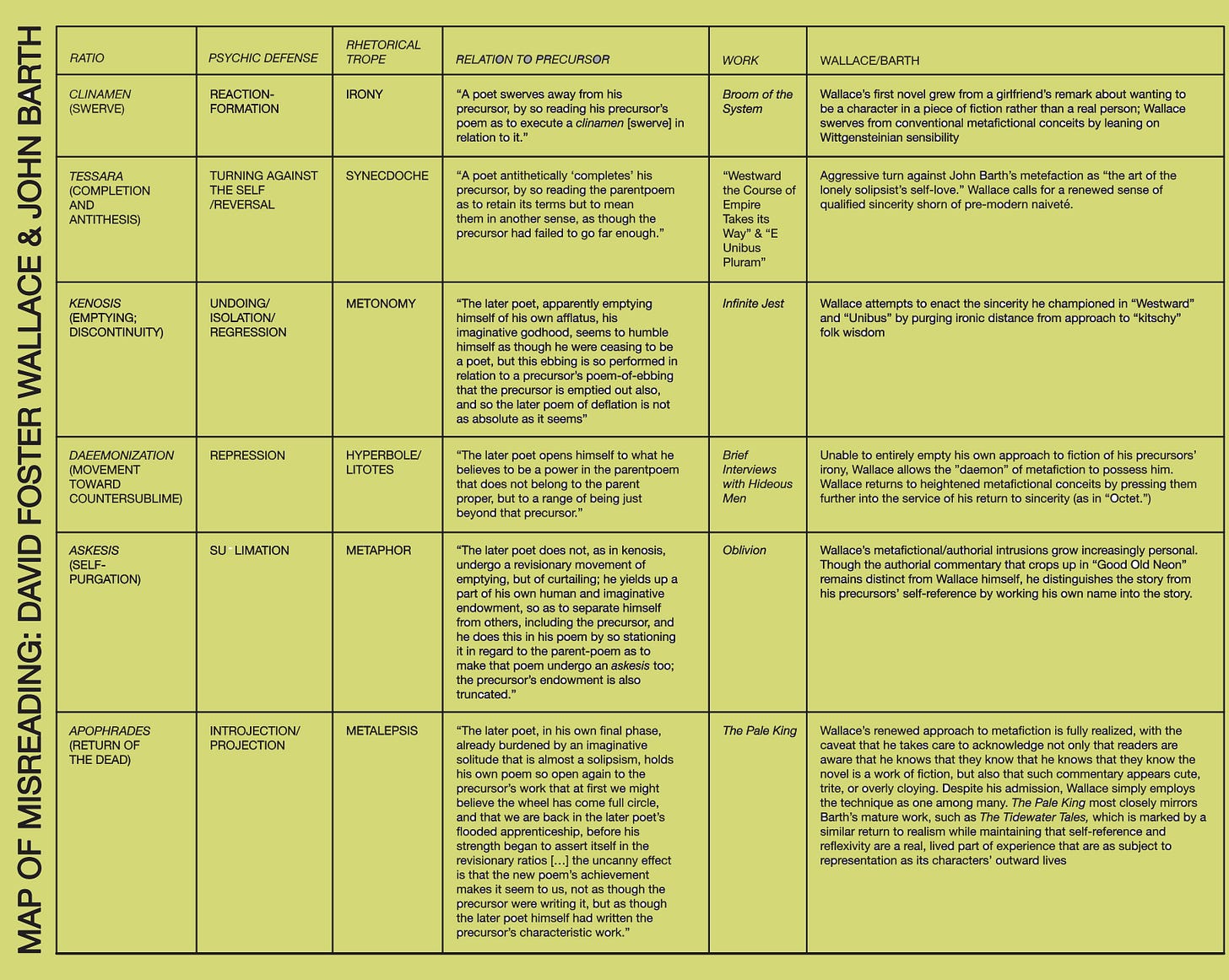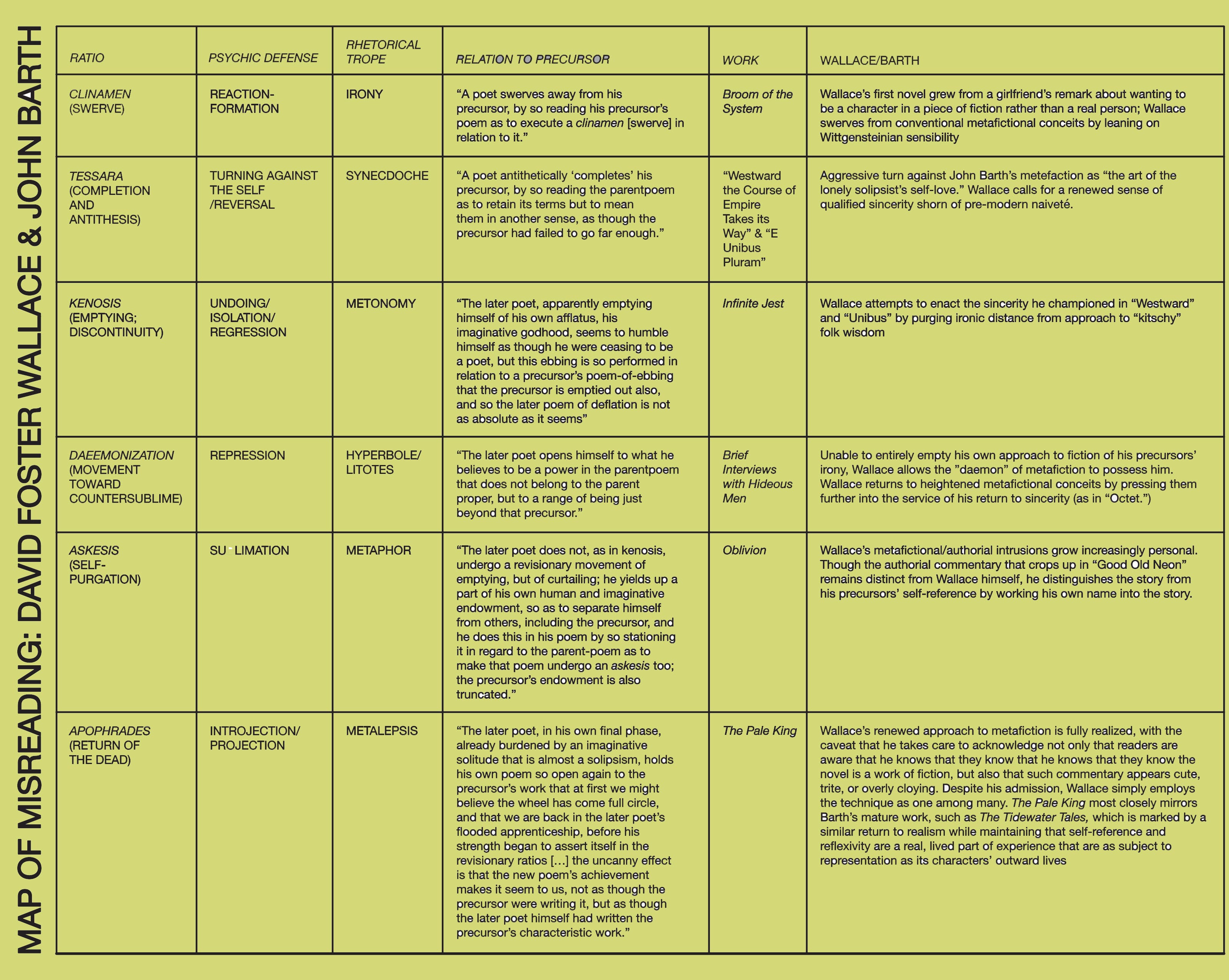 Bloomโs 1973 Anxiety of Influence outlines six โrevisionary ratiosโ that trace the succession of inter-generational aesthetic influence. Bloomโs formula for development is Oedipal: his โconcern is only with strong poets, major figures with the persistence to wrestle with their strong precursors, even to the death.โ Starting with a โswerve,โ successor poets break with their forerunners and move through a series of progressive stages that eventually reconcile their initial break. Above is a copy of Bloomโs table with additional columns tracking Wallaceโs swerve from and eventual reconciliation with his personal precursor, John Barth.
